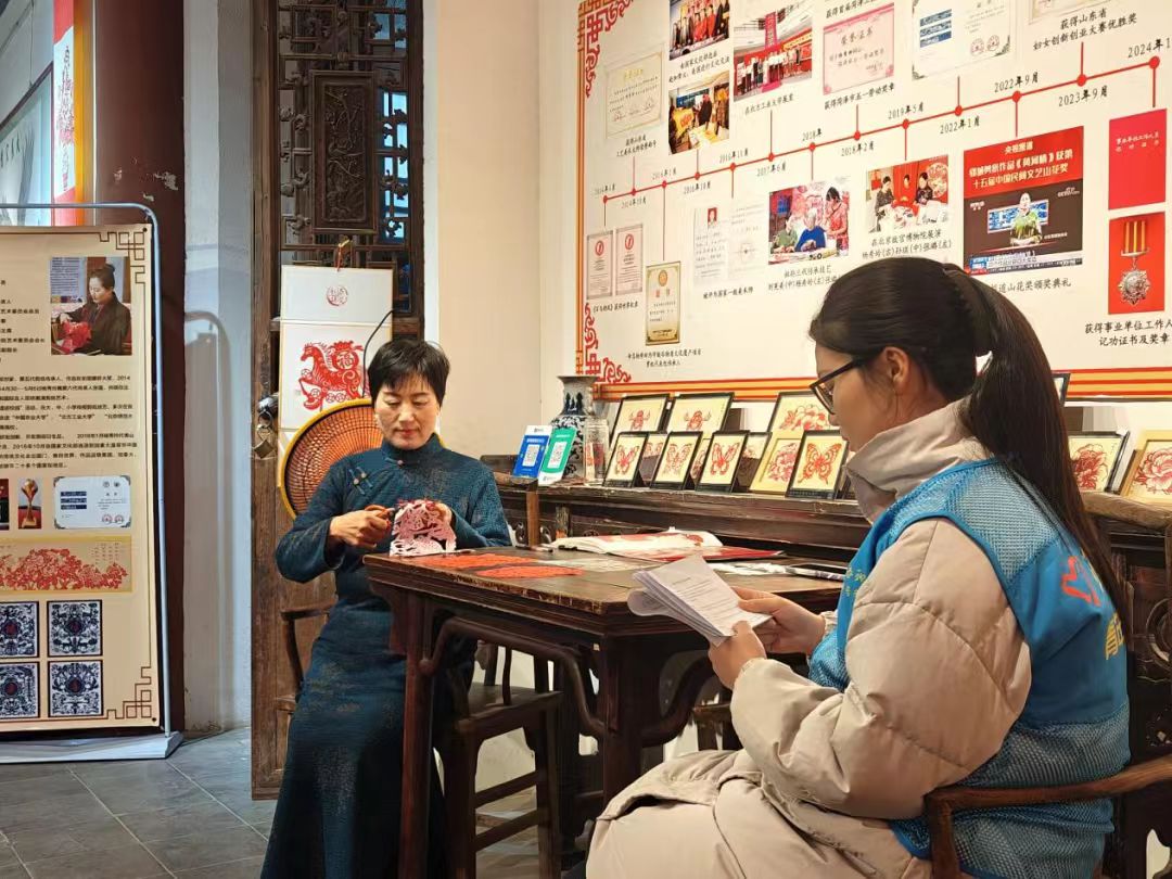 图为实践队队员专访菏泽郓城非遗剪纸传承人杨秀玲