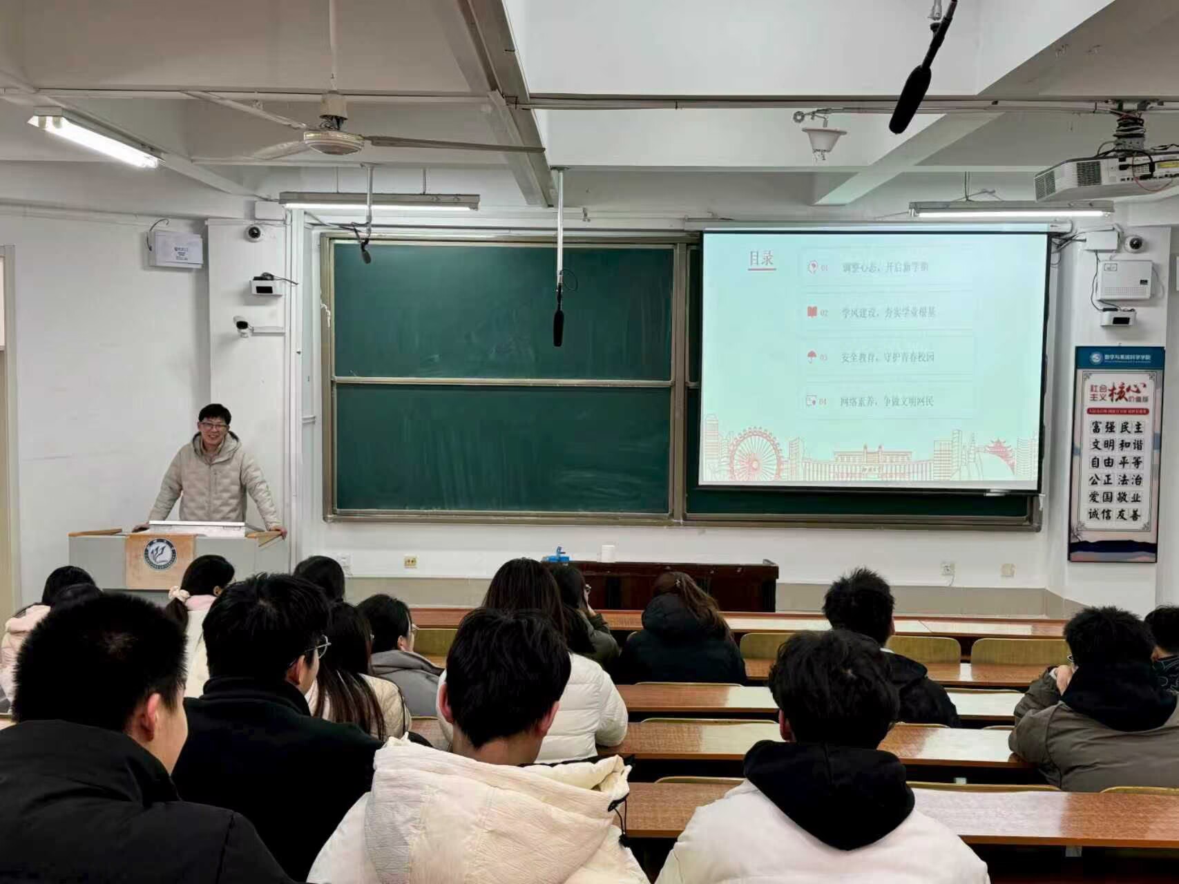 为帮助学生明确新学期方向,增强学生安全意识,夯实学院优良学风根基,3月8日至9日,数学与系统科学学院组织各年级同学开展“开学第一课”主题班会。本次班会由各班班主任主持,围绕心态调整、学风建设、安全教育、网络素养四大核心内容展开,为新学期各项工作的有序开展奠定坚实基础。