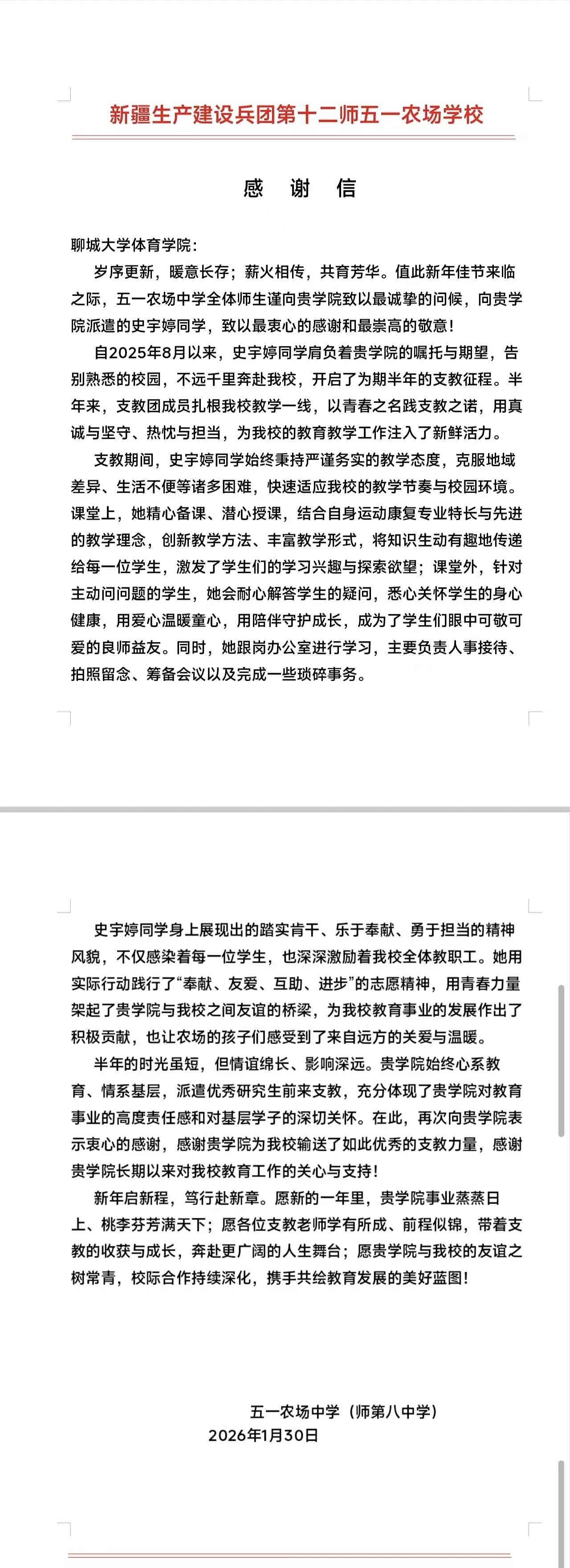 此次收获服务地的广泛赞誉,既是对第27届研支团工作的认可,更是对我校西部计划、研究生支教团工作的肯定。下一步,学校将继续以研究生支教团项目为契机,不断拓展与支教团服务地的深入合作,努力构建“以立德树人为根本,以支教育人为基础,以志愿服务为重点,以协同共建为载体”的校地合作模式,着力将“聊望青年”研支团品牌打造成为聊大学子志愿服务社会、扎根西部基层奉献青春的靓丽旗帜。